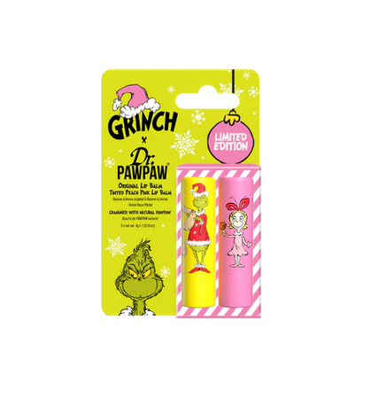 Whoville brings you the Grinch x Dr.PAWPAW fan-favourites duo! The fragrance-free Original Lip Balm teams up with the Tinted Peach Pink Balm for a subtle pop of color, both packed with nourishing PAWPAW to keep your lips cared for all season long. The ultimate duo to shine at any Whobilation!