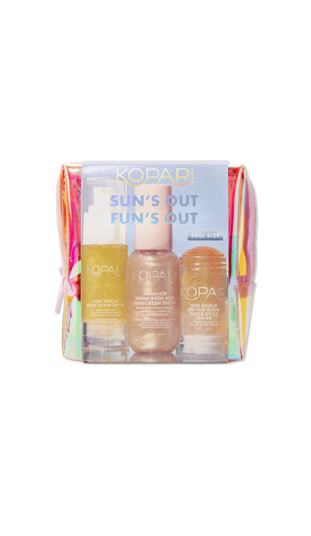Kopari’s Sun’s Out, Fun’s Out SPF Kit keeps your body glowing and protected on the go. Smooth on Body Glow SPF 50, spritz Sheer Body Mist SPF 42, and swipe the On-The-Glow Stick SPF 40 for hydrated, radiant skin – all in our sweet coconut milk scent.