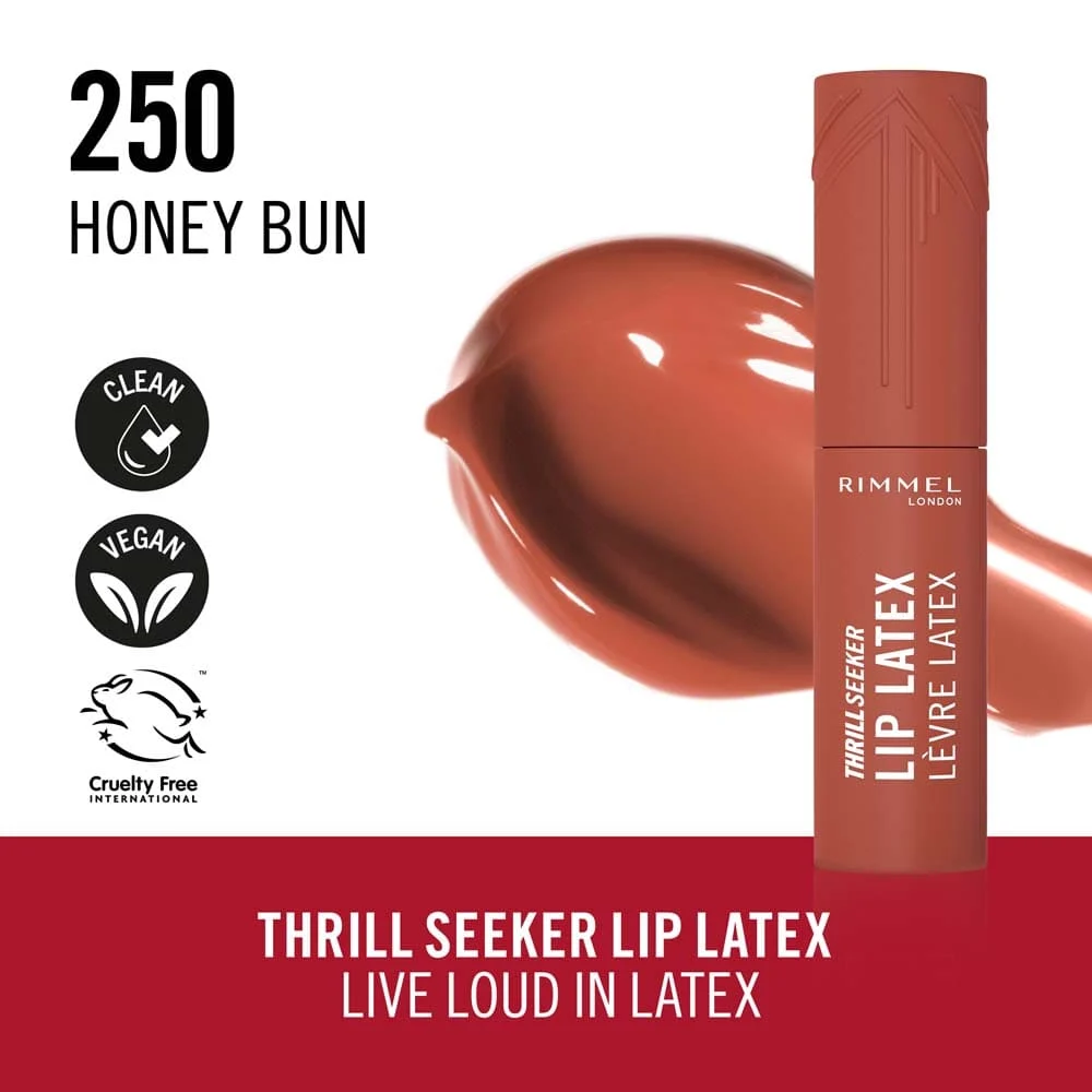 Get a bold unstoppable look in one swipe with Rimmel Thrill Seeker Lip Latex. The liquid lipstick drenches lips in extreme, vivid colour with a lasting lip stain, delivering instant shine, a hit of hydration, comfort that lasts all day and an ultra-smooth finish.